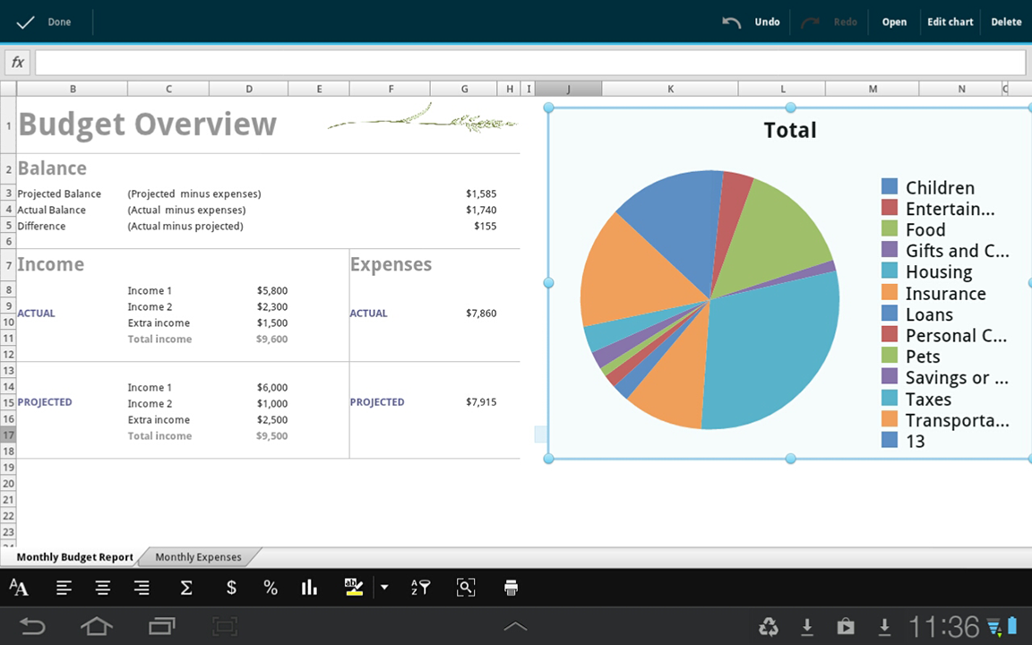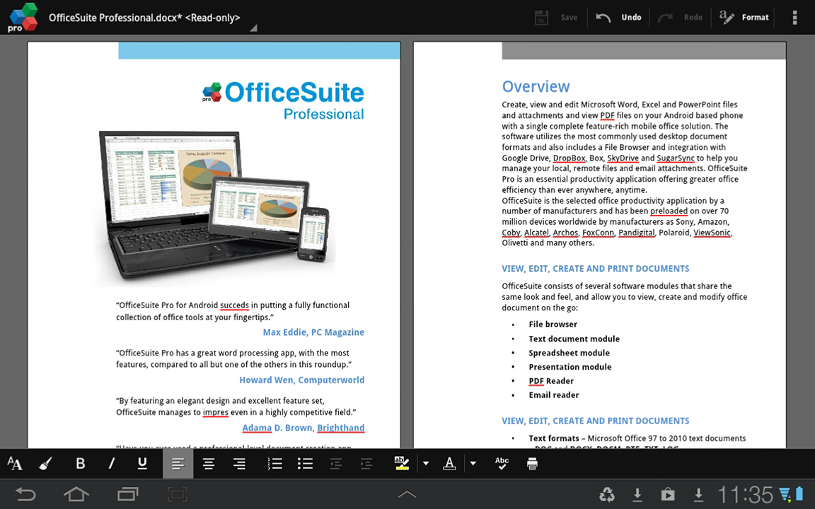 • Two-finger zoom, multi-touch support, context toolbars and popup menus make your work with OfficeSuite quick and fun